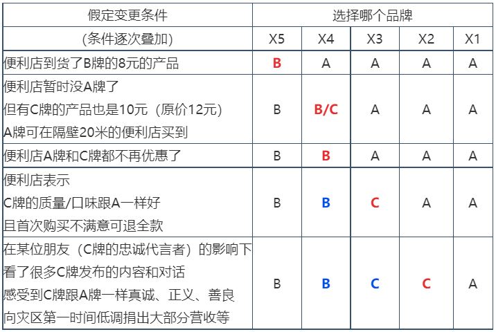 3:X2虽然在外力和自身的影响下尝试了新品牌C,但并非从此成为C牌的情感忠诚者,A牌仍有时间窗口。